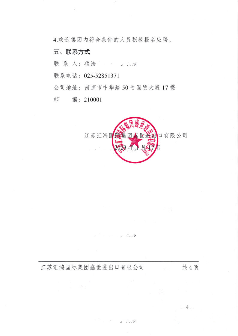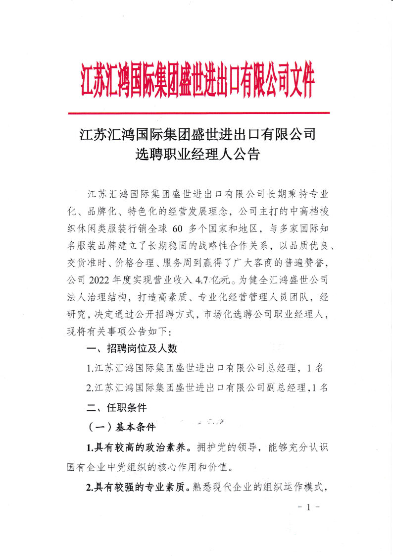江蘇匯鴻國際集團盛世進出口有限公司選聘職業經理人公告